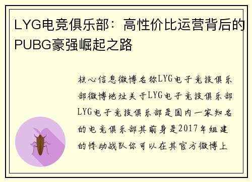 核心信息 * 微博名称:LYG电子竞技俱乐部 * 微博地址: ` 关于LYG电子竞技俱乐部 LYG电子竞技俱乐部是国内一家知名的电竞俱乐部,其前身是2017年组建的“悸动战队”。你可以在其官方微博上了...